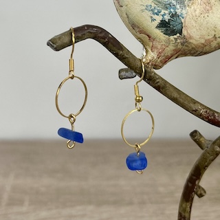 Golden Brass Hook Earrings with Cobalt Blue Sea Glass