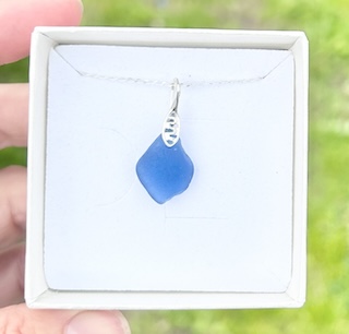 The sea glass is set with a delicate sterling silver bail and suspended from a fine sterling silver chain, blending bold ocean hues with timeless craftsmanship. Its rich blue tone makes it a standout piece for both everyday wear and special occasions.